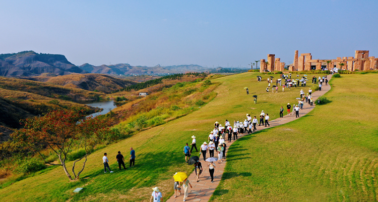 巨石陣由經(jīng)過(guò)切割的丹霞原石堆砌而成,門(mén)形石陣與水中嬌艷的荷花相互輝映,充滿了神秘而獨(dú)特的美感。在這里,建議穿著純色長(zhǎng)裙,穿梭于石拱門(mén)之間,利用光影的變幻營(yíng)造出神秘而迷人的氛圍,隨手一拍都是大片。夏季傍晚時(shí)分,這里還常有民俗表演,火把巡游的熱烈與丹霞夜景的靜謐相結(jié)合,氛圍感直接拉滿。