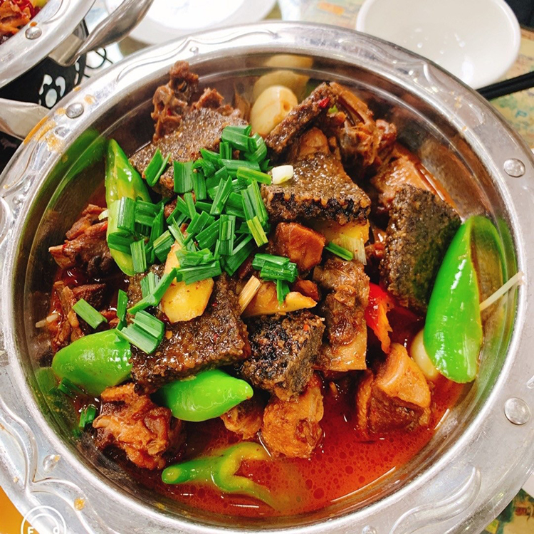 洪江血粑鴨是湘西極具代表性的一道菜肴,味道濃郁,美味獨特。把鴨肉放入到油鍋中,加入干辣椒、生姜、調(diào)味食材、糯米等一起翻炒,把鴨肉炸出油后倒入清水和鴨血小火燜煮,直至鴨肉酥爛。嘗上一口滿嘴油香,鴨肉酥爛入味,鮮味十足,極具風(fēng)味。