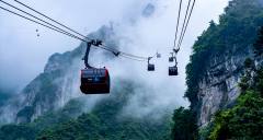天門山索道全長7455米,水平高差1279米,沿線盡為絕壁天險,氣勢沖天,是世界上最為壯觀的索道之一。它以張家界市中心城市花園為起點,經(jīng)民間田園風光而達山頂?shù)脑伎罩谢▓@,猶如一道彩虹飛渡“人間”“天上”。