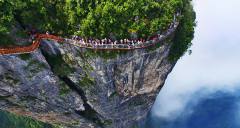 棧道全長1600米,平均海拔為1400米,起點是倚虹關(guān),終點到小天門。與其他棧道不同的是,鬼谷棧道全線既不在懸崖之巔,也不在懸崖之側(cè),而是全線都立于萬丈懸崖的中間,給人以與懸崖共起伏同屈伸的感覺。 站在棧道上俯瞰群山,古人“會當凌絕頂,一覽眾山小”的感覺油然而生。由于天門山是國家森林公園,植被特別豐富,加上典型的喀斯特地貌,所以,在這條棧道上更能找到一種在乘坐直升飛機飛越熱帶雨林大峽谷的感覺,這平時只能在電影里看到的場景,在這里能讓你身臨其境。 由于海拔和氣流的影響,很多小鳥都不能到達與棧道平行位置。所以,站在這里,腳下是沒有邊際的綠野,成群的小鳥在峽谷中嬉戲,偶爾有老鷹從眼前掠過,閉上眼,挺著發(fā)麻的雙腿,帶著急促的心跳,伸開雙臂,你就能得到一次最完美、最刺激、最貼近自然的SPA。因為,要知道這種在懸崖上賞風景一般都是非人類所能享受的。 如果是雨前雨后,在棧道上則是身邊霧氣盤繞,腳下云海翻騰,令人抬腿似生霧,邁步如踏云,人間天界,世外洞天也就是如此了。 據(jù)施工人員介紹,此條棧道也是他們所修棧道中施工最難,最險峻的一條。如果您還覺得不夠刺激的話,在棧道的完結(jié)處的兩個懸崖之間有一條長160米的懸索吊橋,同時,在海拔最高點還有一個挑戰(zhàn)心里極限的玻璃站臺,在這里,如果你能挺直腰板伸開雙臂,那么,您就是真正的勇士了。